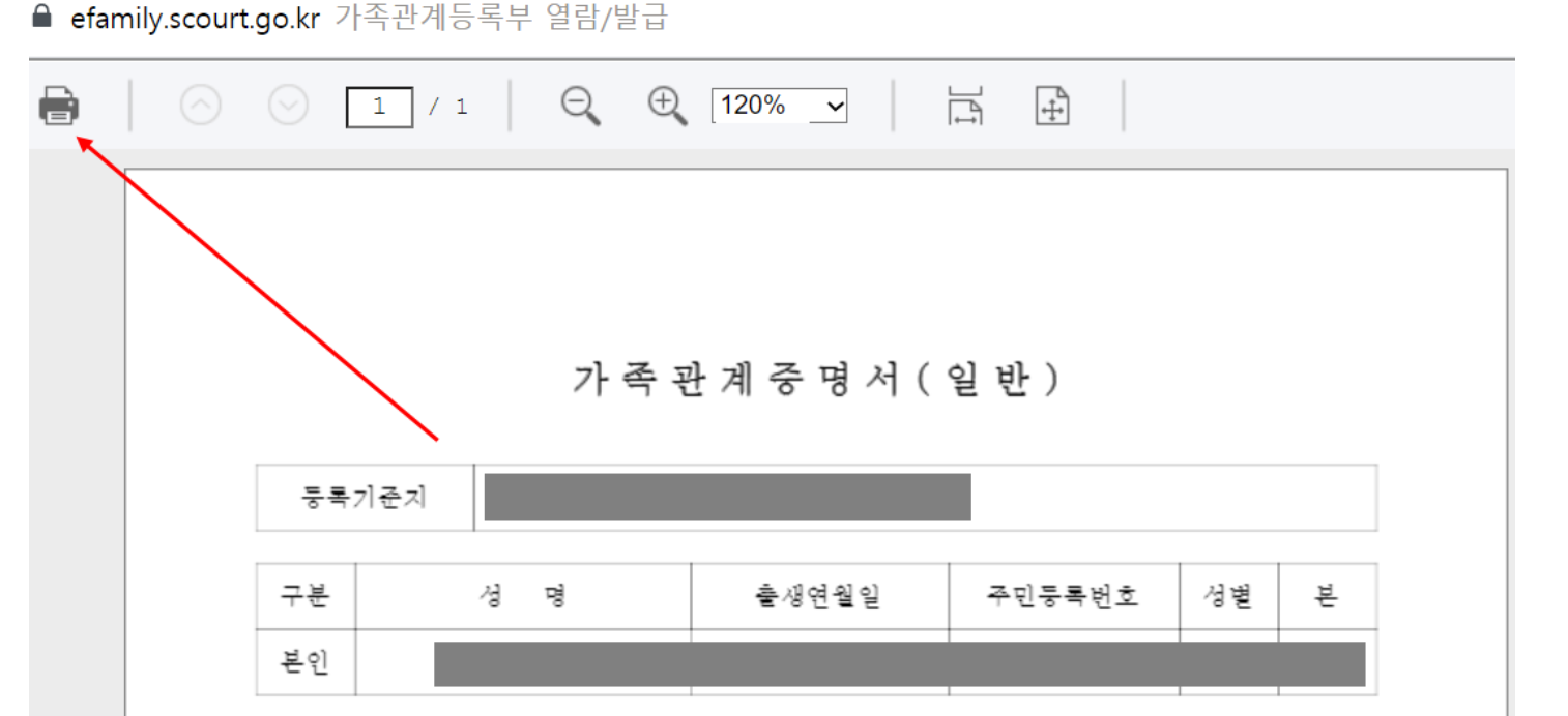 7. 새로운 창에서 가족관계증명서 인터넷발급 화면이 나타납니다. 여기서 좌측의 프린터 모양을 클릭하면 출력할 수 있습니다. (PDF 저장도 가능합니다.)
