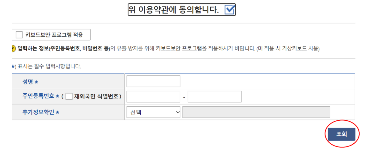 4. 아래 동의합니다에 체크하신 후 본인성명, 주민번호, 추가정보확인을 기입한 후 조회를 클릭합니다.