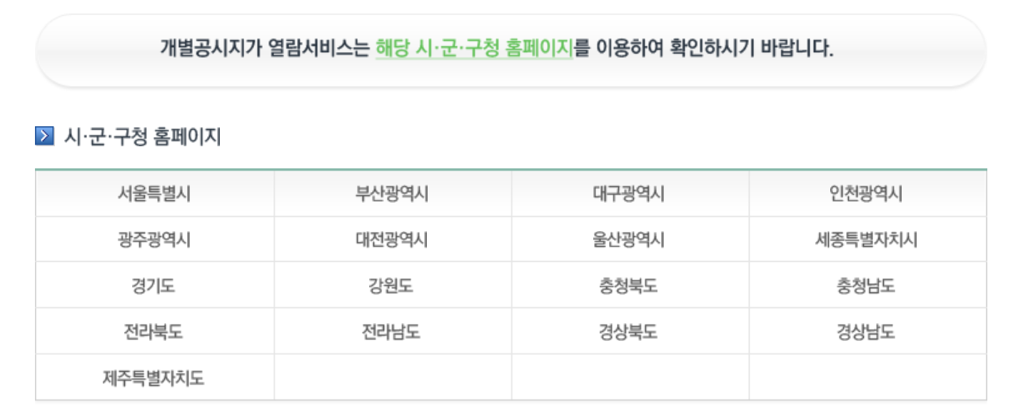 (3) 그럼 지역별 시군구청 홈페이지가 안내됩니다. 원하는 부동산의 지역 홈페이지를 클릭해 들어가주세요.