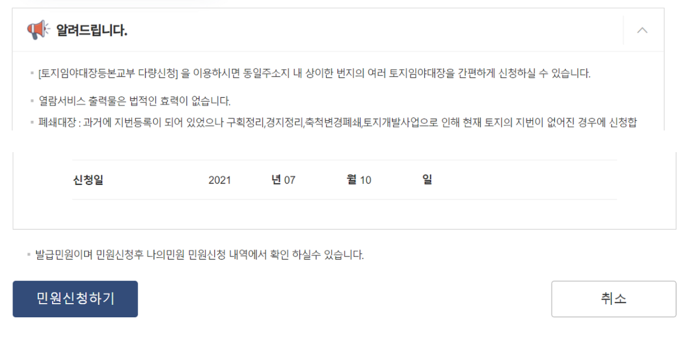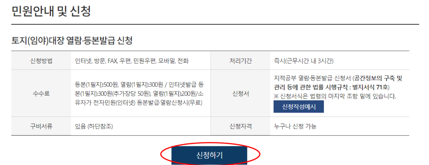 2. 토지대장 열람 및 등본 발급 신청 화면입니다. 신청하기를 눌러주세요.