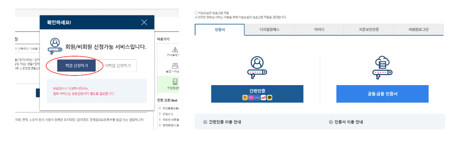 3. 본인확인을 위한 창이 뜹니다. 회원 신청하기 클릭 후 공인인증서, 카카오톡, 패스 등을 통해 로그인을 해주세요.