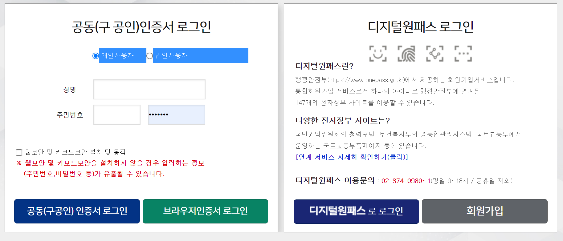 3. 로그인이 필요합니다. 공인인증서 혹은 디지털원패스 등을 통해 인증을 진행해주세요.