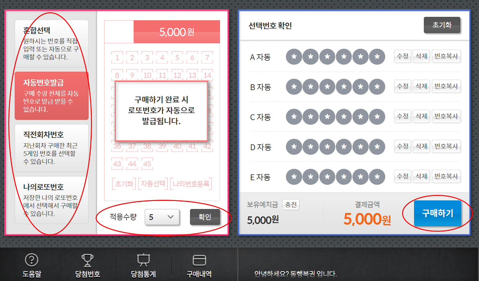 4. 메인화면에서 상단메뉴 중 복권구매를 클릭 후 원하는 서비스를 선택해주세요.