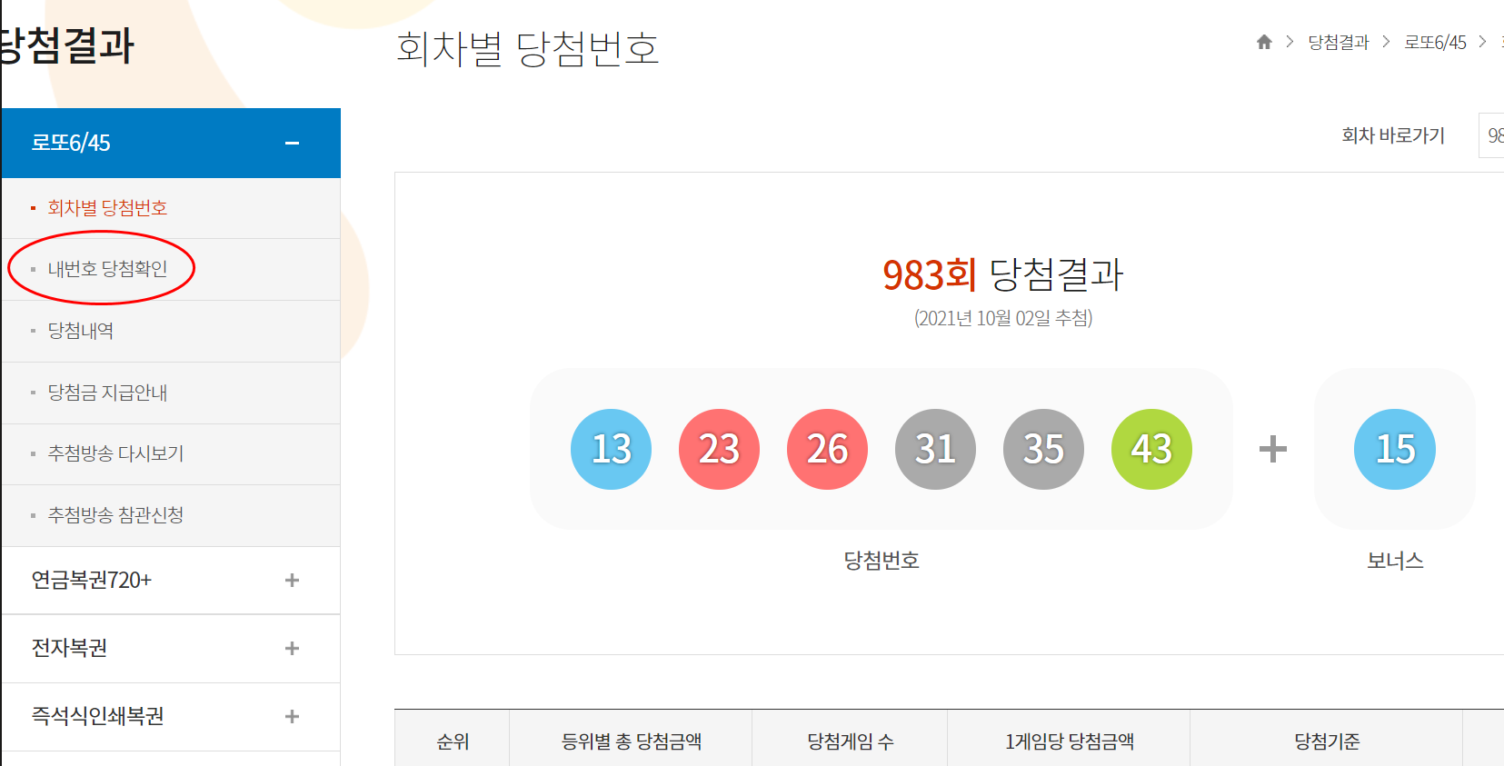 상단메뉴에서 당첨결과를 클릭하면 본인의 당첨내역은 물론 회차별 당첨결과도 확인할 수 있습니다. 본인이 인터넷은 물론 직접 현장방문해 구매한 복권 역시 확인이 가능한데요. 좌측의 내번호 당첨확인으로 들어가시면 됩니다.